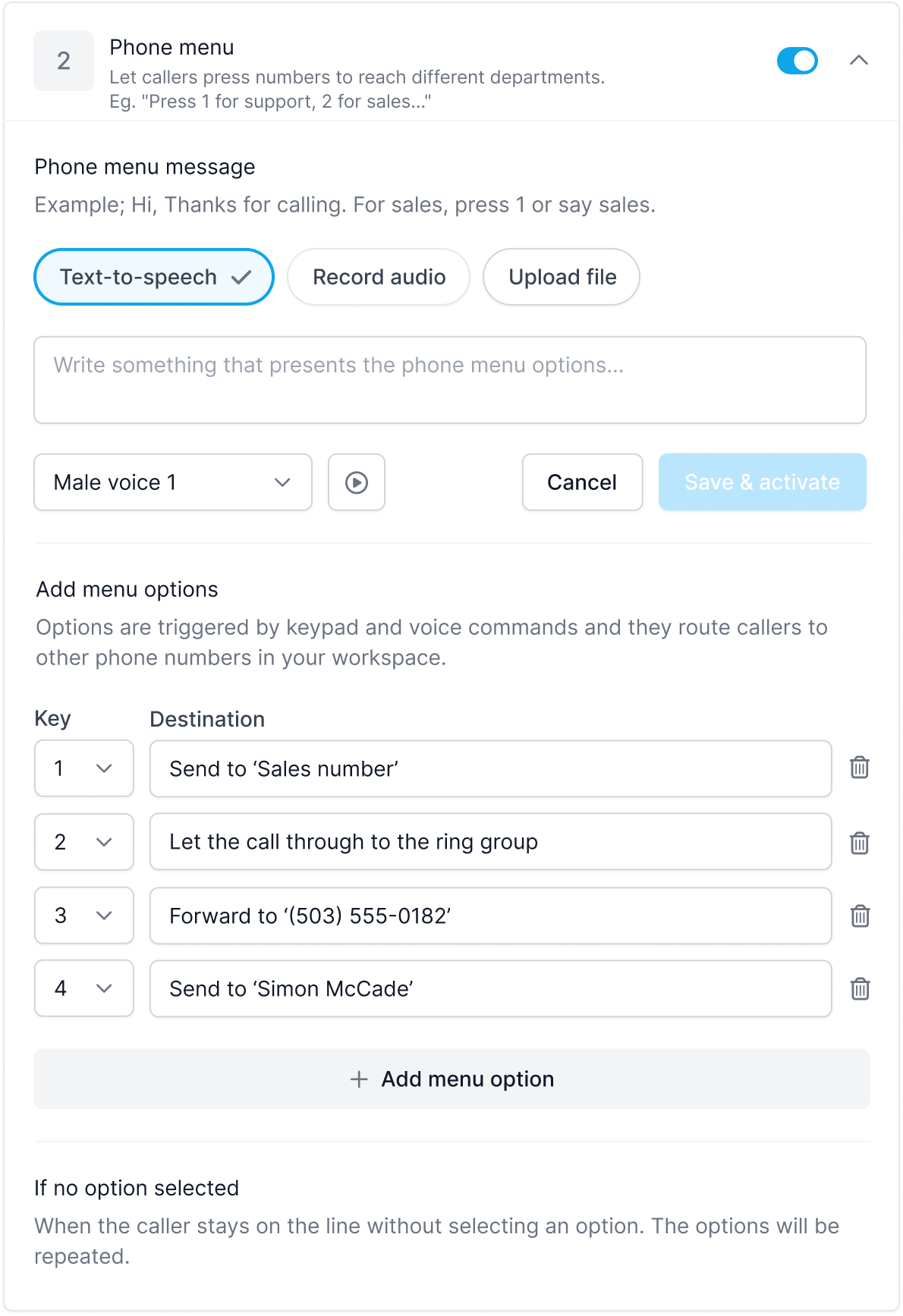 Sound like an enterprise from day one with a professional phone menu that routes callers and answers common questions.